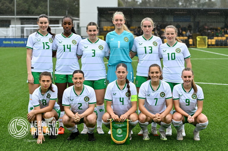 24 September 2023; The Republic of Ireland team, back row, from left, Aoife Kelly, Eve Dossen, Lia O’Leary, goalkeeper Katie Keane, Ceola Bergin and Freya Healy. Front row, from left, Jess Fitzgerald, Meabh Russell, captain Kate Thompson, Jodie Loughrey and Joy Ralph before the Women’s U19 international friendly match between Northern Ireland and Republic of Ireland at Blanchflower Stadium in Belfast. Photo by Ben McShane/Sportsfile