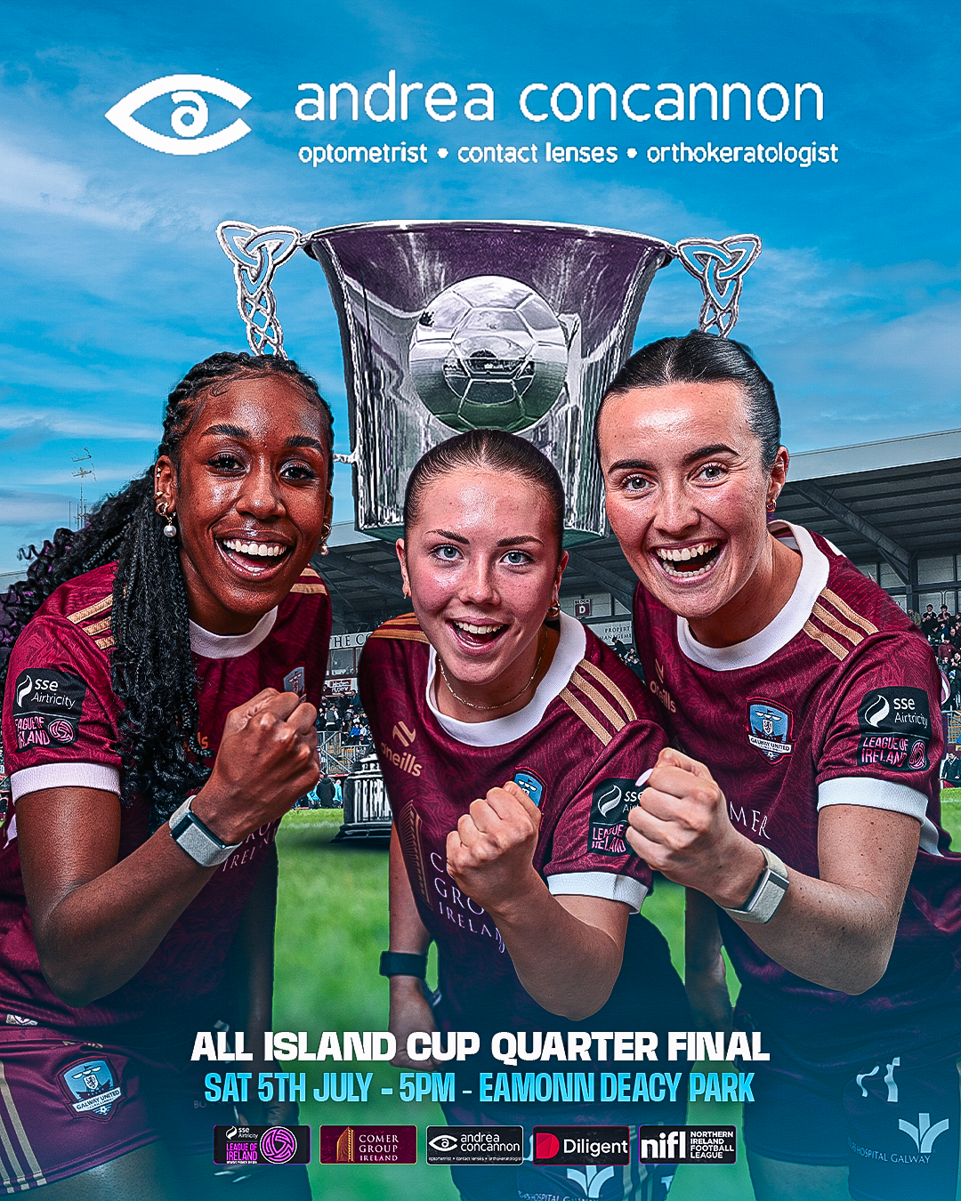 We’re delighted to share that Andrea Concannon Opticians join us as Match Partners for our Senior Women’s All-Island Cup Quarter Final against Shamrock Rovers on Saturday 5th July.Located in Salthill, Concannon Opticians have been providing a range of professional eye care services in Galway since 2002, delivering a professional, friendly & attentive service focused on the health of your eyes.