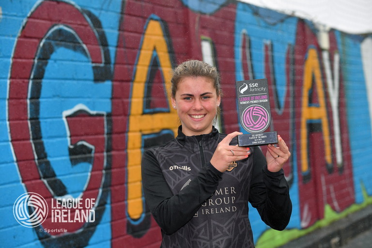12 May 2023; Jenna Slattery of Galway United with her SSE Airtricity Player of the Month Award for April 2023 at Eamonn Deacy Park in Galway. Photo by Ray Ryan/Sportsfile