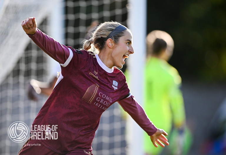 12 October 2024; Julie-Ann Russell of Galway United celebrates scoring her side’s first goal during the SSE Airtricity Women’s Premier Division match between Galway United and Athlone Town at Eamonn Deacy Park in Galway. Photo by Piaras Ó Mídheach/Sportsfile