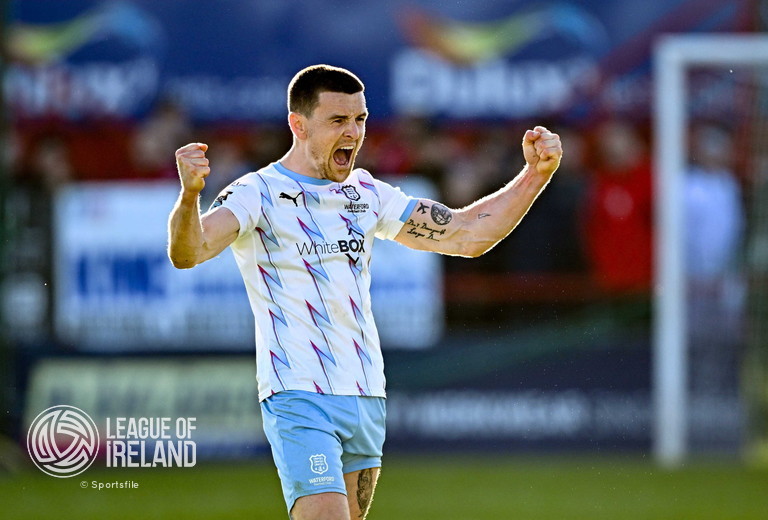 5 May 2025; Darragh Leahy of Waterford celebrates at the final whistle after his side’s victory in the SSE Airtricity Men’s Premier Division match between Shelbourne and Waterford at Tolka Park in Dublin. Photo by Seb Daly/Sportsfile