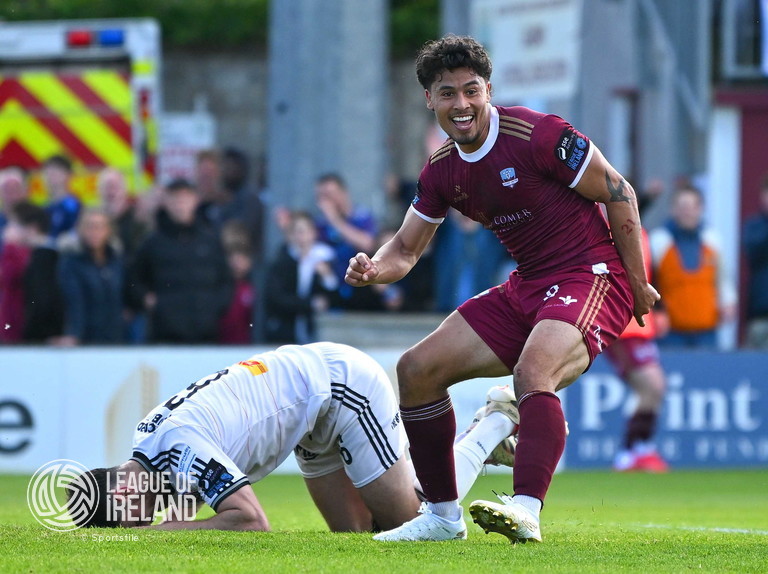 5 May 2025; Moses Dyer of Galway United, celebrates after scoring his side’s first goal during the SSE Airtricity Men’s Premier Division match between Galway United and Bohemians at Eamonn Deacy Park in Galway. Photo by Brendan Moran/Sportsfile